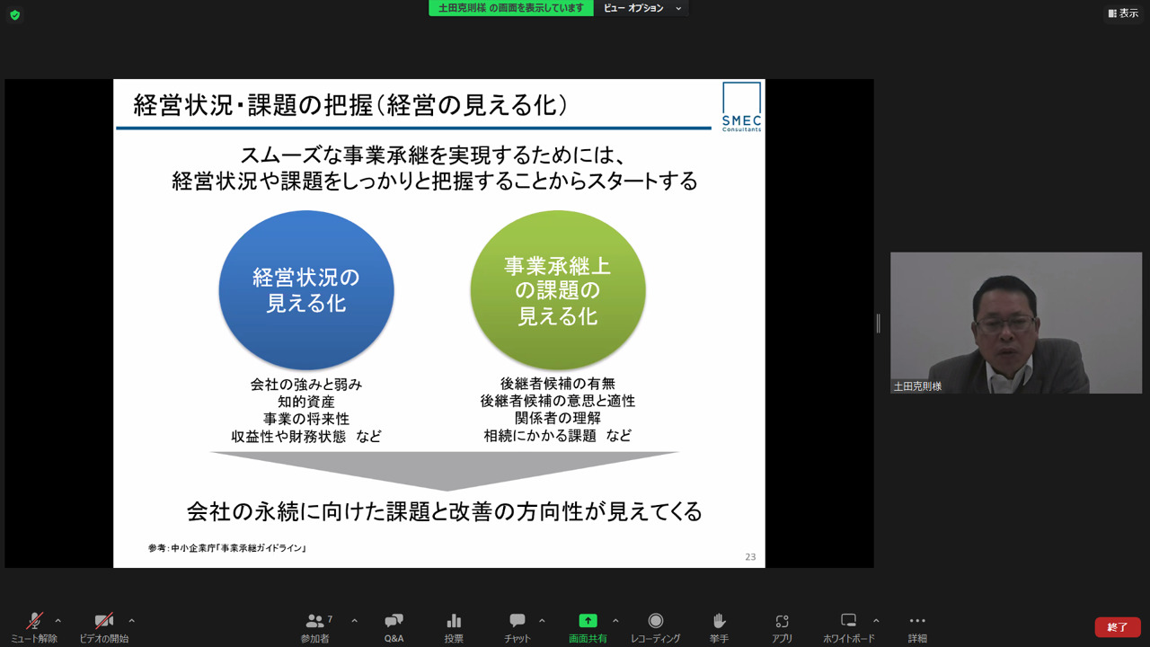 事業承継をご経験されていらっしゃる、SMECコンサルタンツ株式会社 取締役の土田克則氏を講師としてお招きし、ご自身の事業承継のご経験も交えながら熱い語り口で「経営者」目線に立ってお話しいただきました。