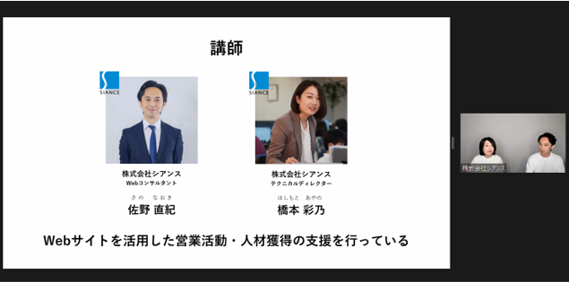 IT導入に関わるサービスの提供を展開している株式会社シアンスから、佐野 直紀 氏と橋本 彩乃 氏の2名を講師としてお招きし、ChatGPTを使ったことがない人でもわかるように、デモンストレーションを交えながら嚙み砕いてお話しをいただきました。