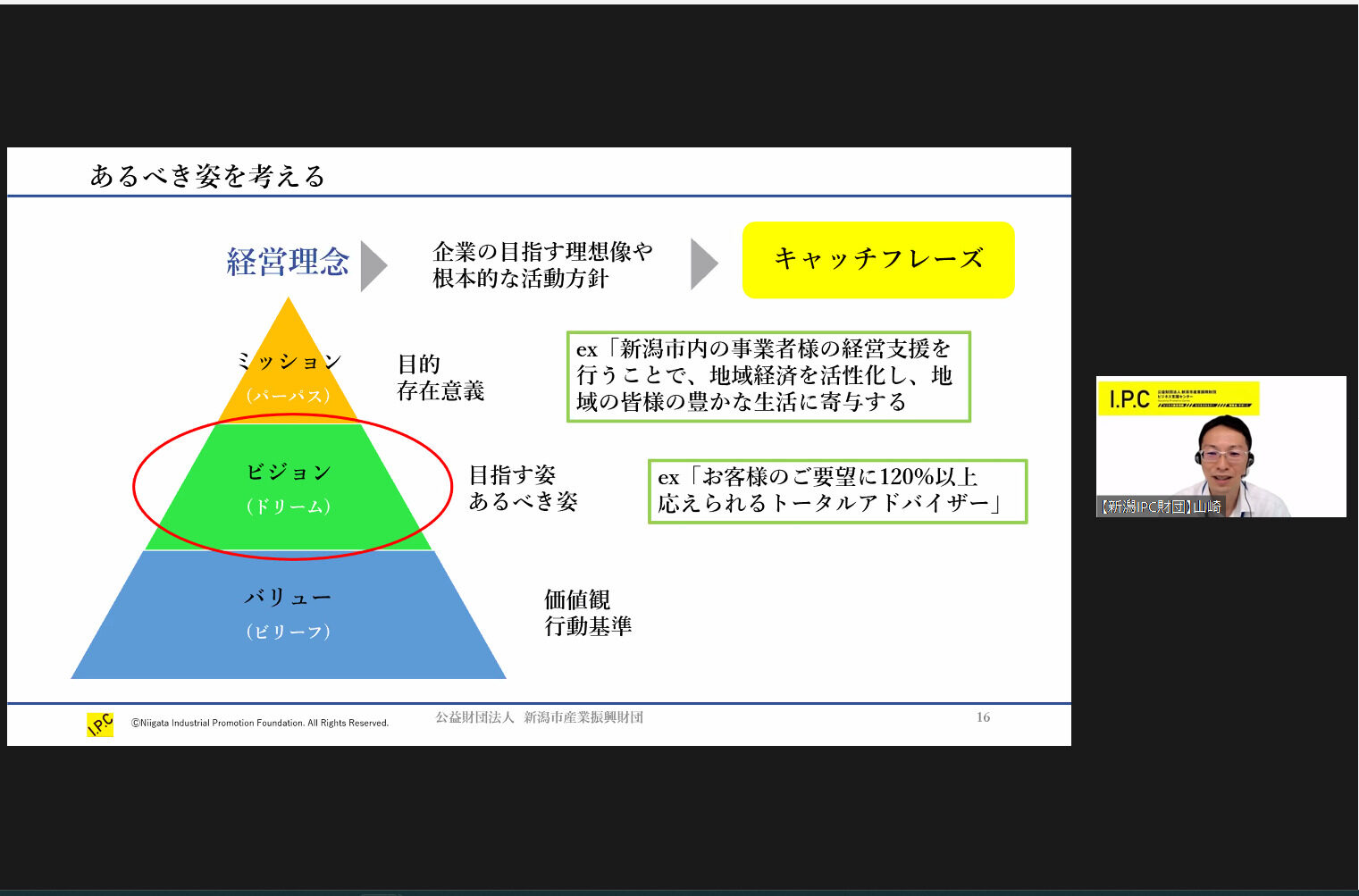 まず、事業とは何か、経営とは何かという導入から始めました。「自分のやりたいこと」「できること」「役立つこと」の3つの観点で新事業を考えることから起業・新事業に繋げていきます。