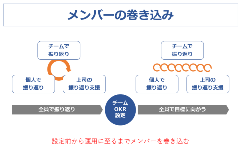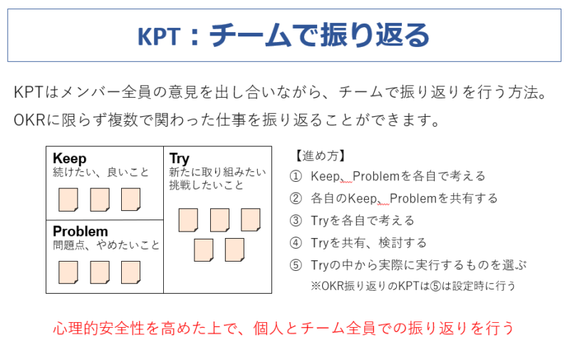 心理的安全性を保ち、目的と目標をもつ個人とチームで振り返ることで、ゴールを達成するしくみをつくりましょう。