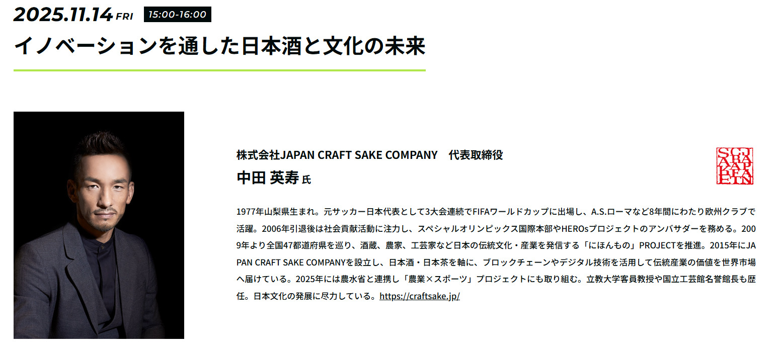 元サッカー日本代表で、JAPAN CRAFT SAKE COMPANY 代表取締役 中田 英寿 氏をはじめとする、ビジネス界で著名なビジネスパーソンが登壇!
