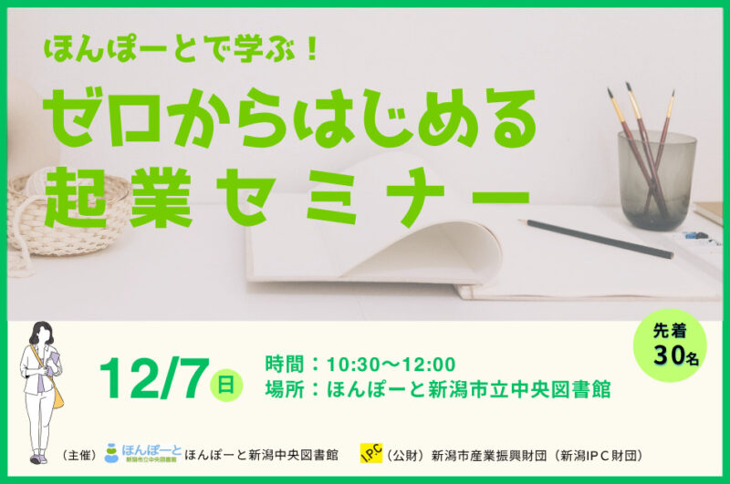 開催日時 2025年12月07日(日) 会場 ほんぽーと新潟市立中央図書館 3階 多目的ホール 受講料 無料 - 起業